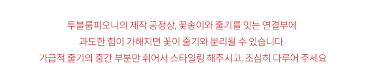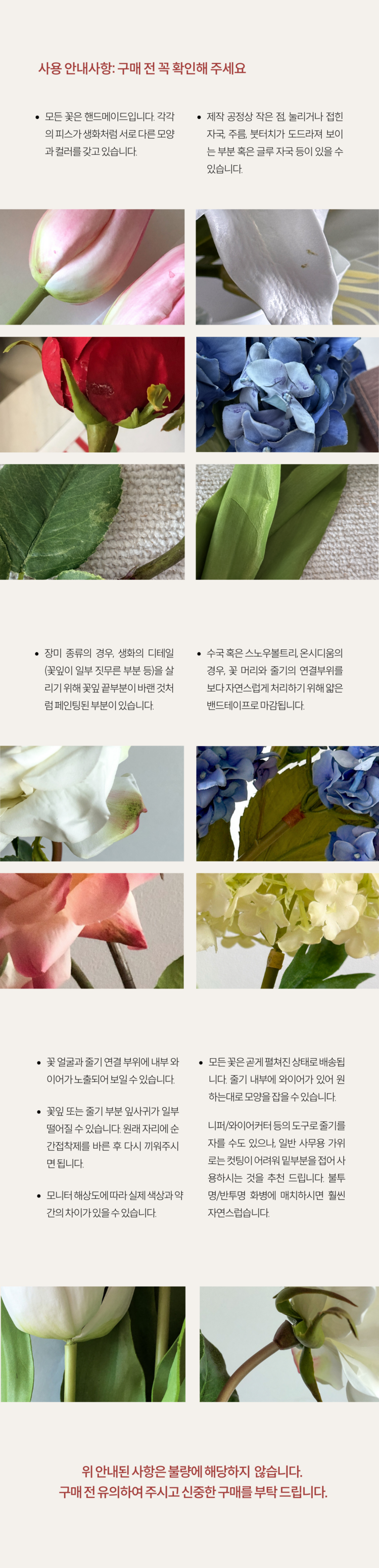간혹 사진으로 볼 때와 실물이 다른 조화들이 있죠. 오래 두고 볼 조화를 고르실 때에는, 줄기의 디테일 또는 휘어짐이 자연스러운지, 꽃잎/잎사귀 사이즈가 생화와 비슷한지, 컬러가 자연스럽게 그라데이션 되어 있는지 등을 자세히 확인해 보세요.