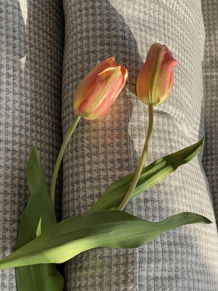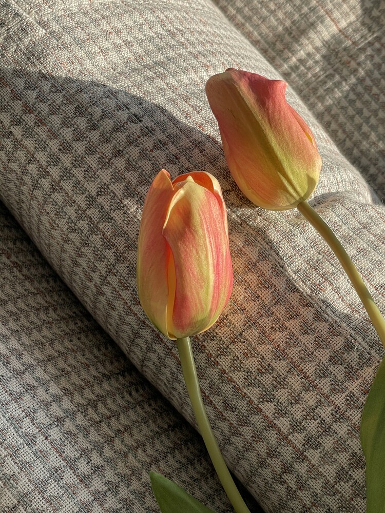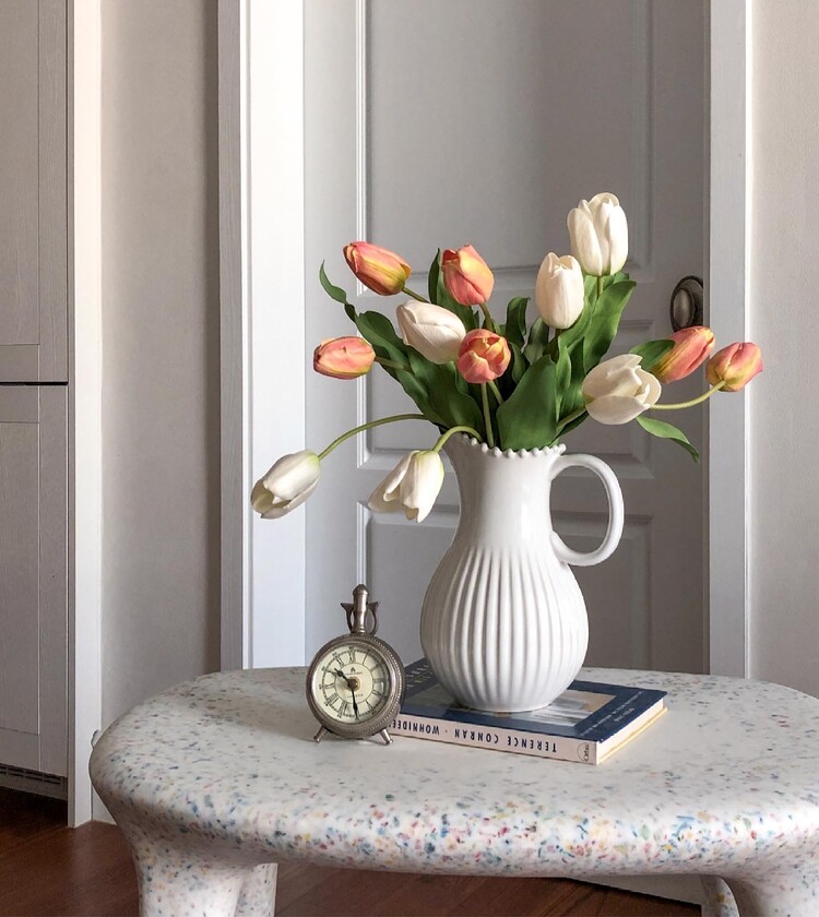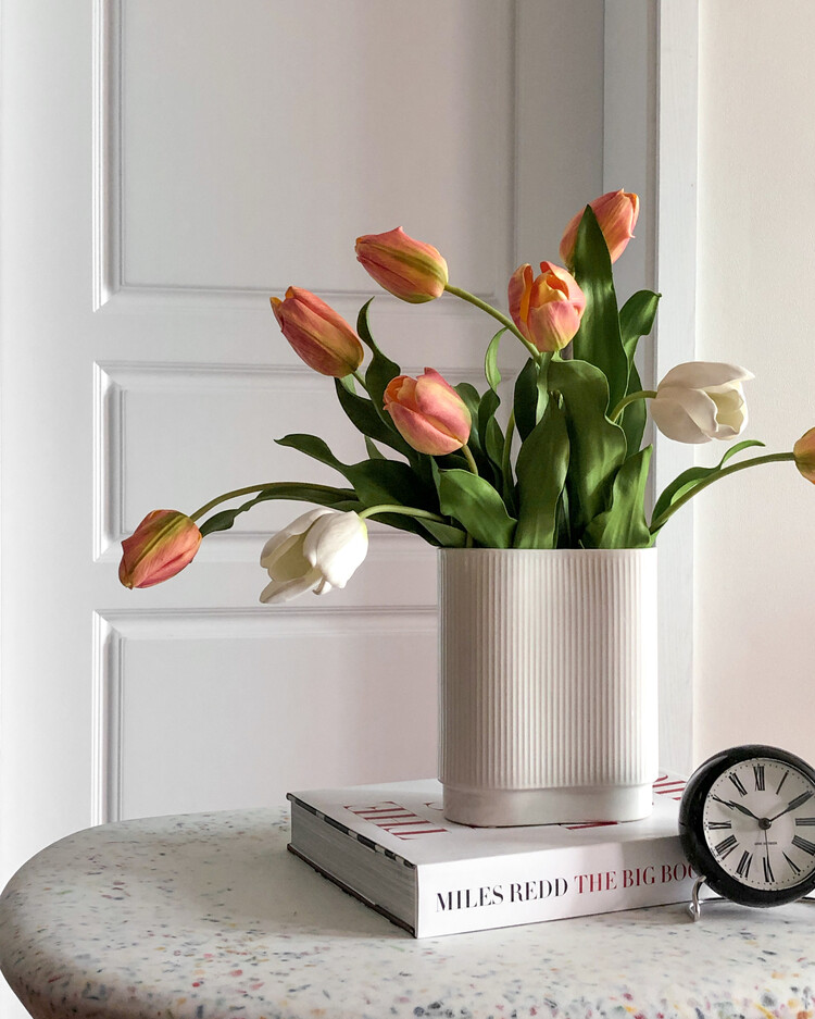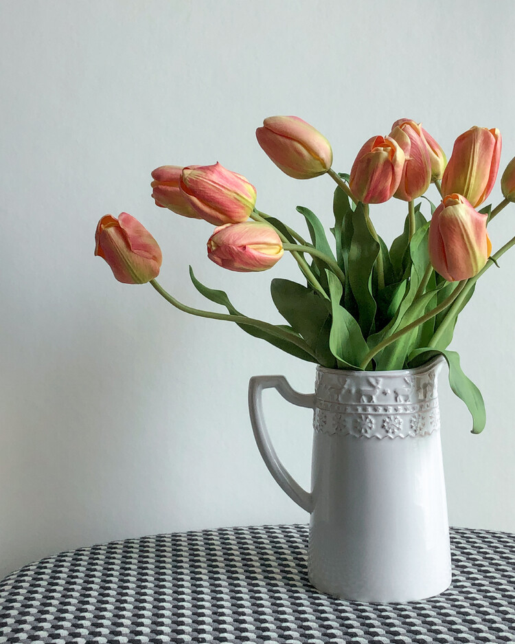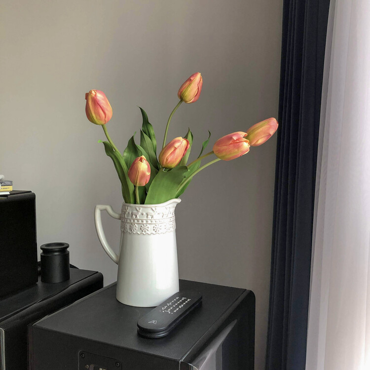 * 높이 20cm, 지름 12cm 화병에 총 12송이 스타일링한 모습입니다. 흰 튤립과 함께 연출하였어요.