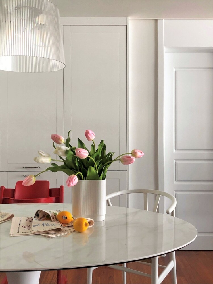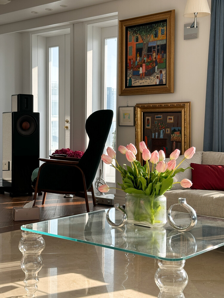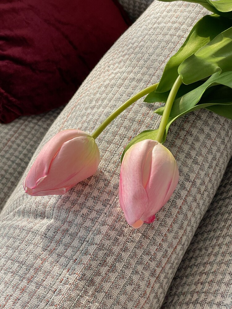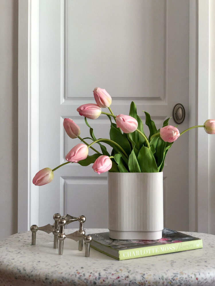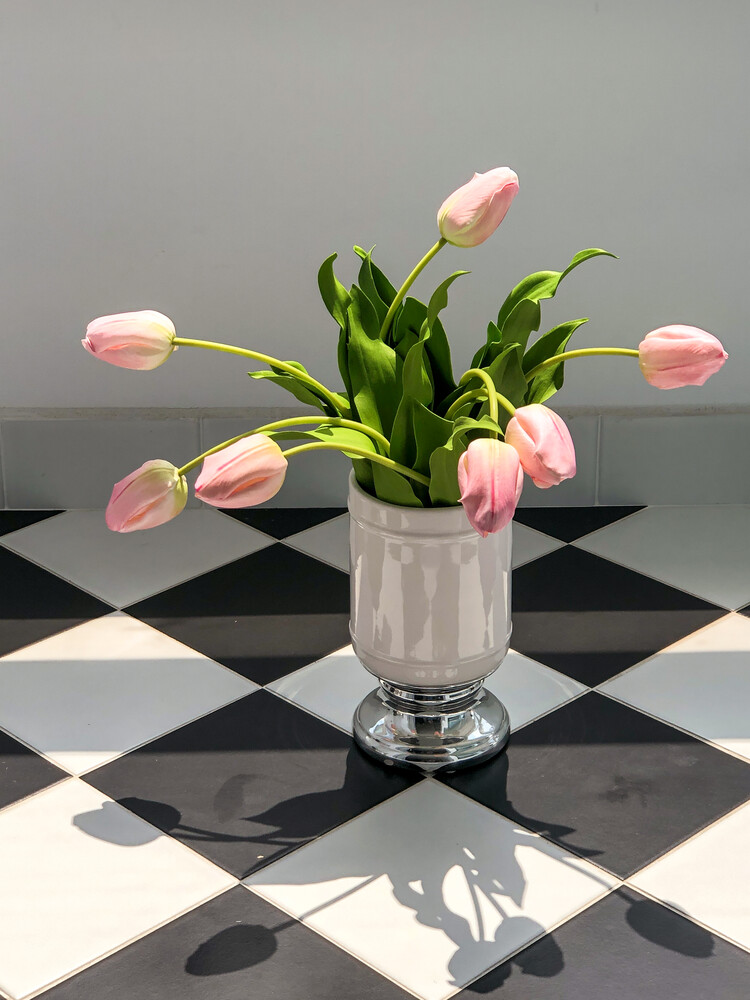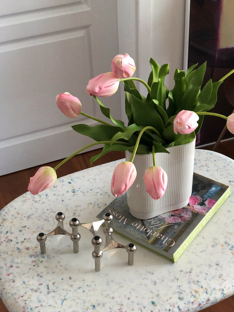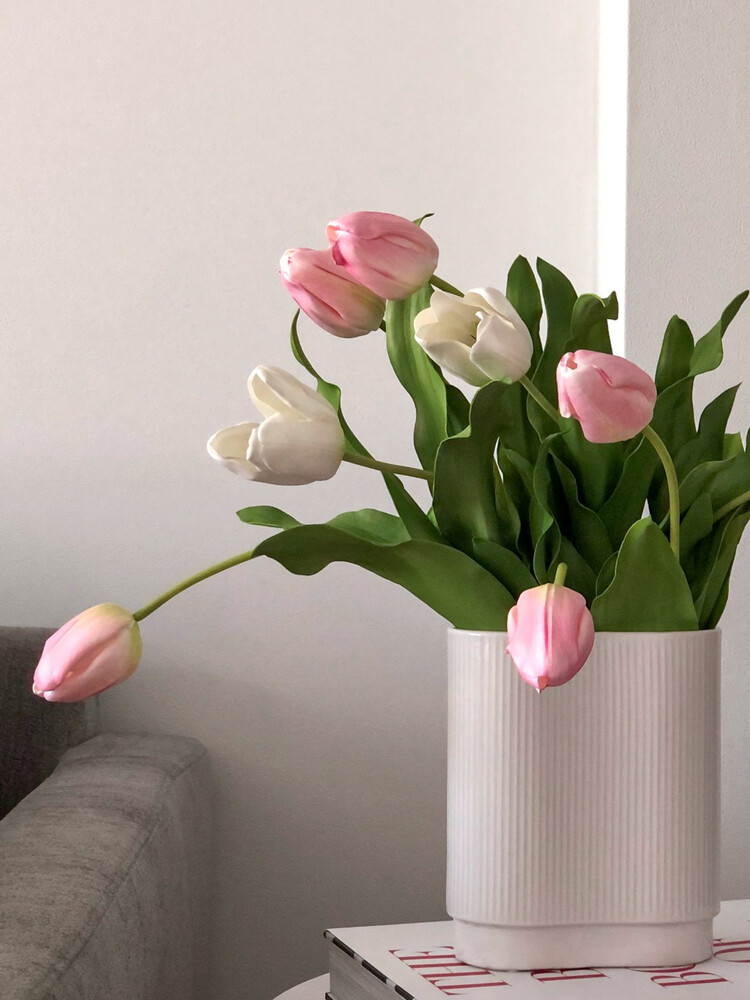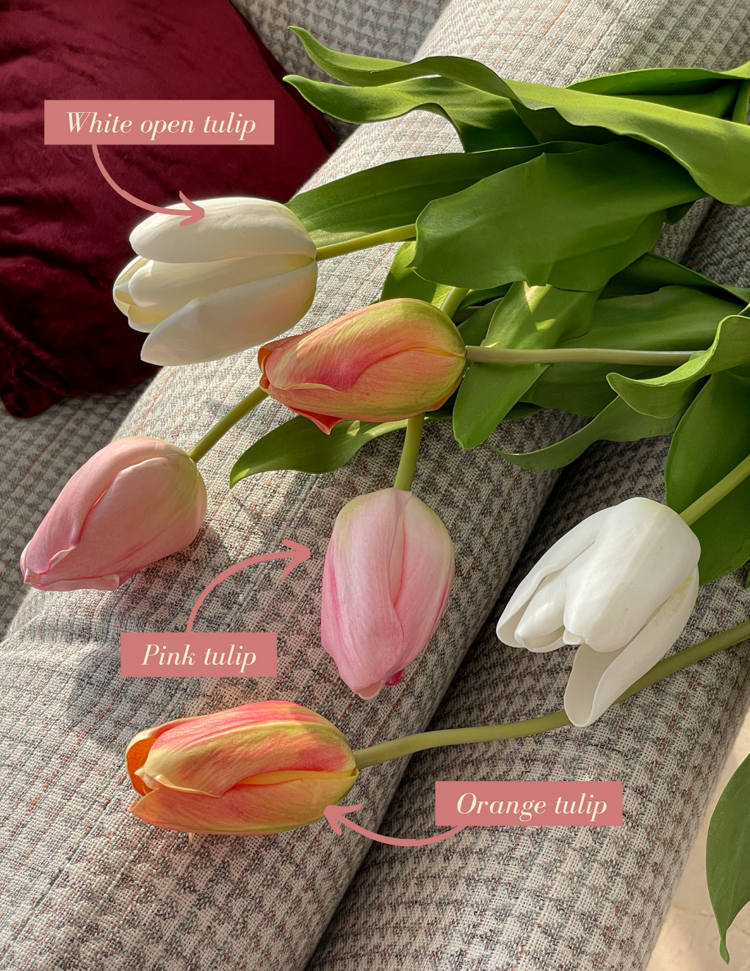 부드럽고 은은한 컬러의 핑크 튤립입니다. 채도가 많이 높지 않은 창백한 페일핑크 컬러예요. 시중의 일반적인 튤립 조화에 비해 꽃/잎사귀 사이즈가 큰 편이라 더욱 생화와 비슷한 느낌이에요. 핑크/연한 그린 컬러가 자연스럽게 믹스되어 있고, 꽃잎 표면의 결도 살아있어요. 튤립 특유의 휘어지는 모습도 내부의 와이어로 자연스럽게 표현할 수 있습니다. 꽃잎은 닫혀 있는 모양이에요. 핑크 단독으로 사용해도 좋고, 화이트 오픈 튤립과 함께하면 더 자연스럽고 사랑스러운 분위기를 연출하실 수 있습니다.