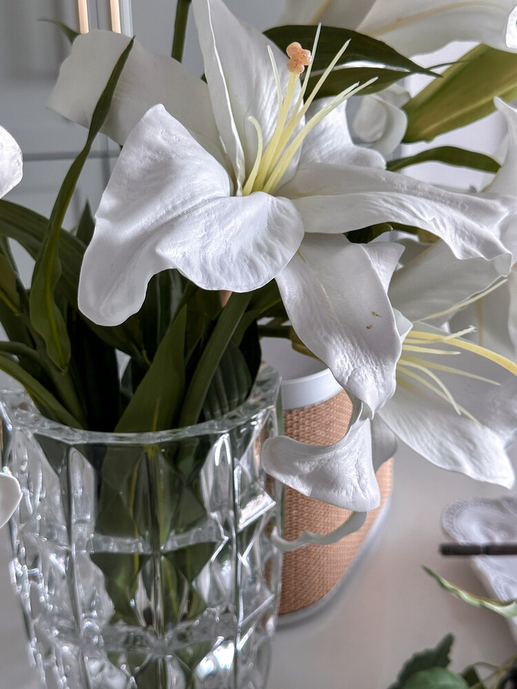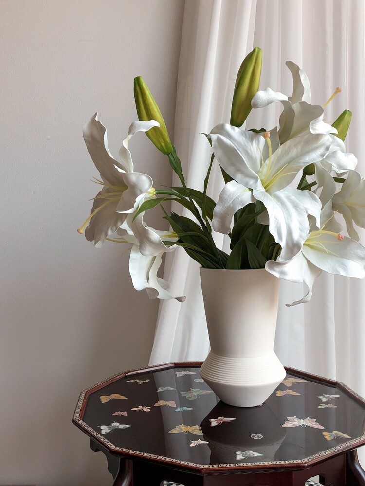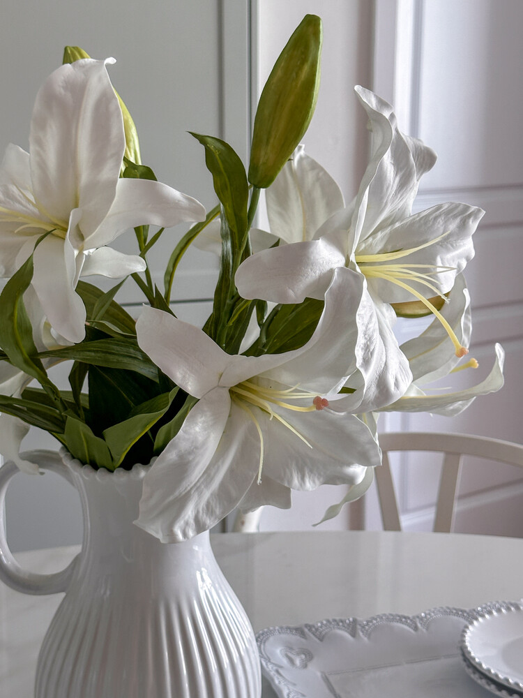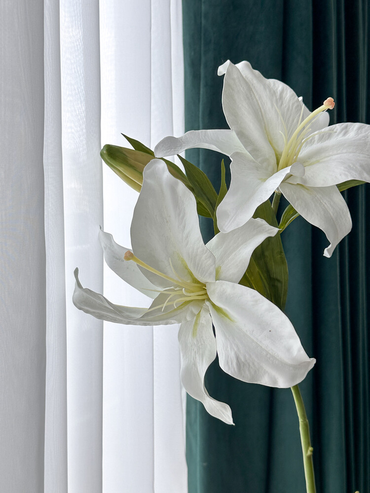 줄기 한 대에 큰 꽃 2송이가 달려 있는 화이트 백합입니다. 청순하고 소박한 것 같으면서도 꽃 얼굴이 커 화려해 보이기도 하는 매력적인 꽃이에요. 초록 잎 컬러가 아주 자연스럽고, 꽃잎의 매트한 질감과 잔잔한 주름들까지 잘 구현되어 있어요. 꽃 중앙의 수술 부분은 아주 연한 그린 컬러를 입혀 매트한 질감으로 마감되어 있습니다.