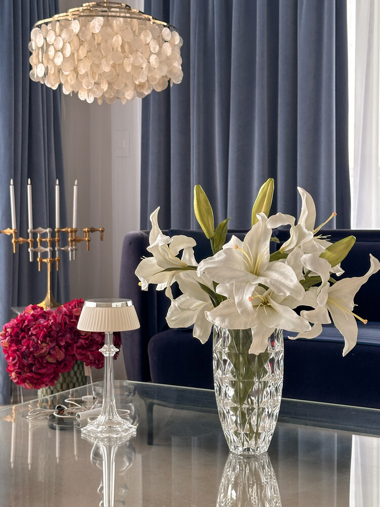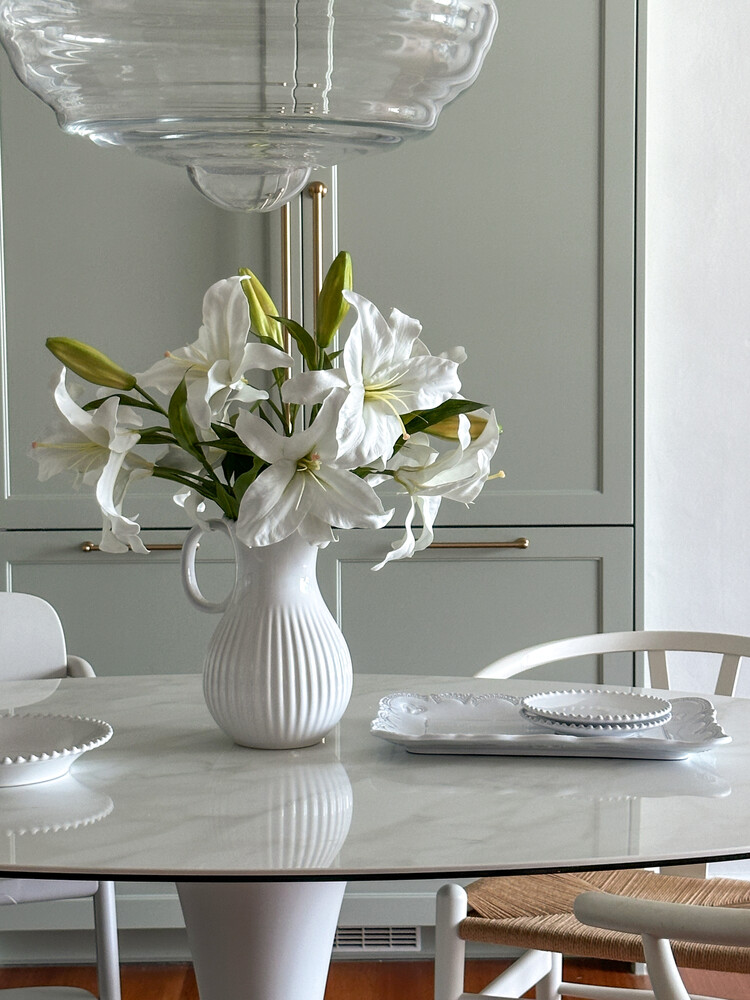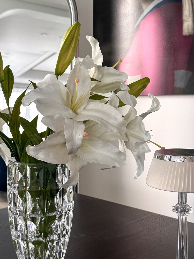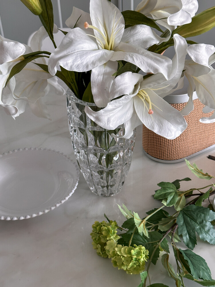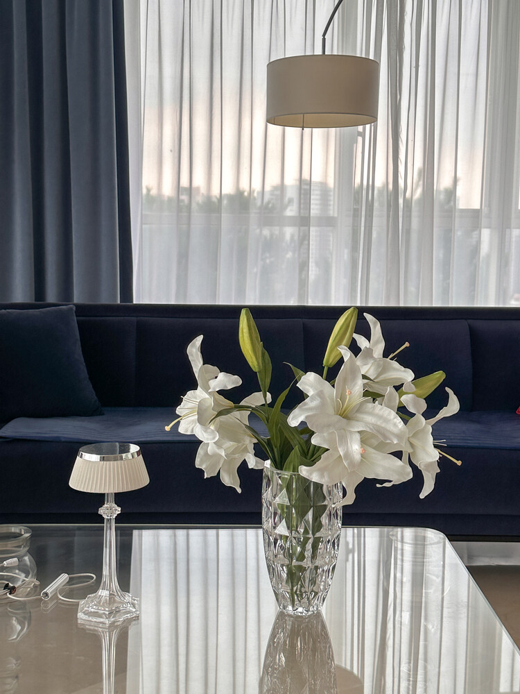 줄기 한 대에 큰 꽃 2송이가 달려 있는 화이트 백합입니다. 청순하고 소박한 것 같으면서도 꽃 얼굴이 커 화려해 보이기도 하는 매력적인 꽃이에요. 초록 잎 컬러가 아주 자연스럽고, 꽃잎의 매트한 질감과 잔잔한 주름들까지 잘 구현되어 있어요. 꽃 중앙의 수술 부분은 아주 연한 그린 컬러를 입혀 매트한 질감으로 마감되어 있습니다.