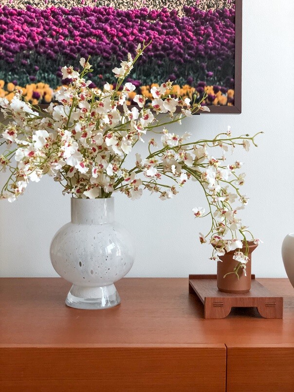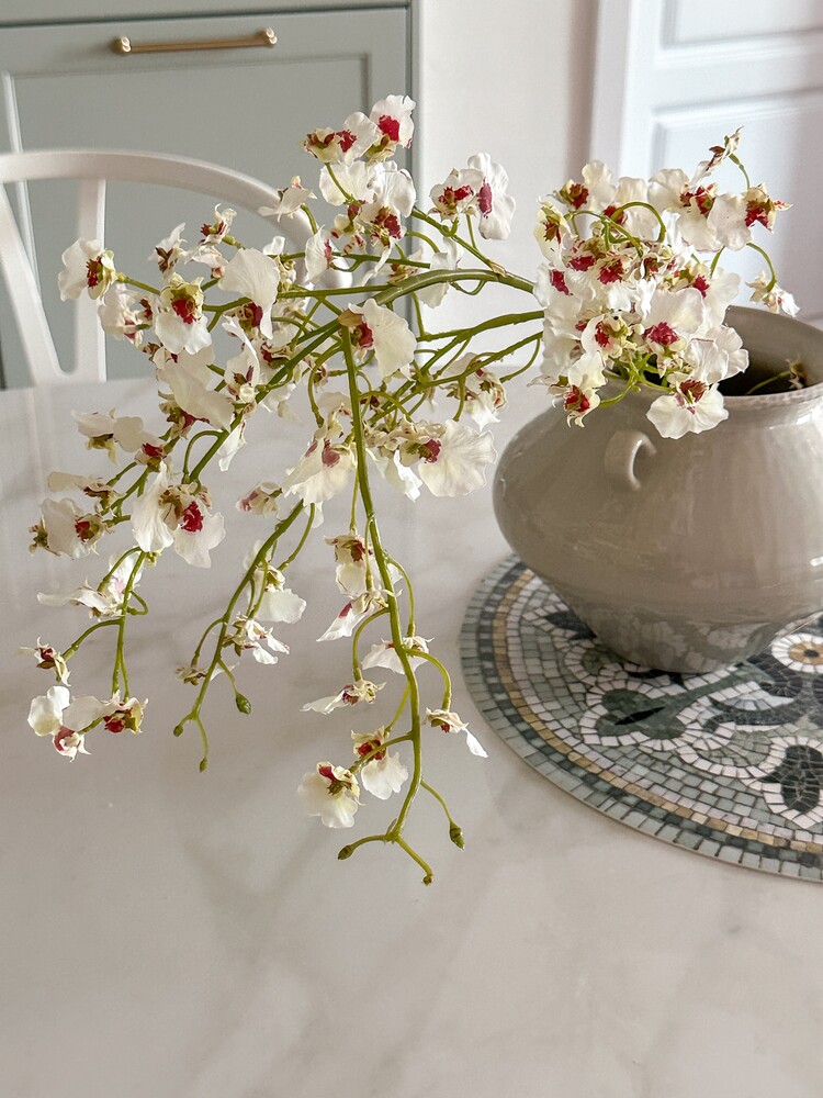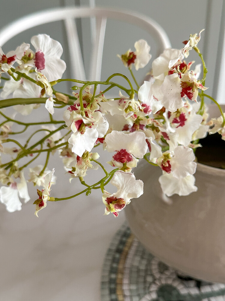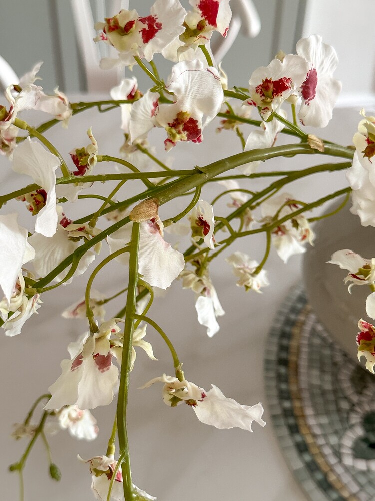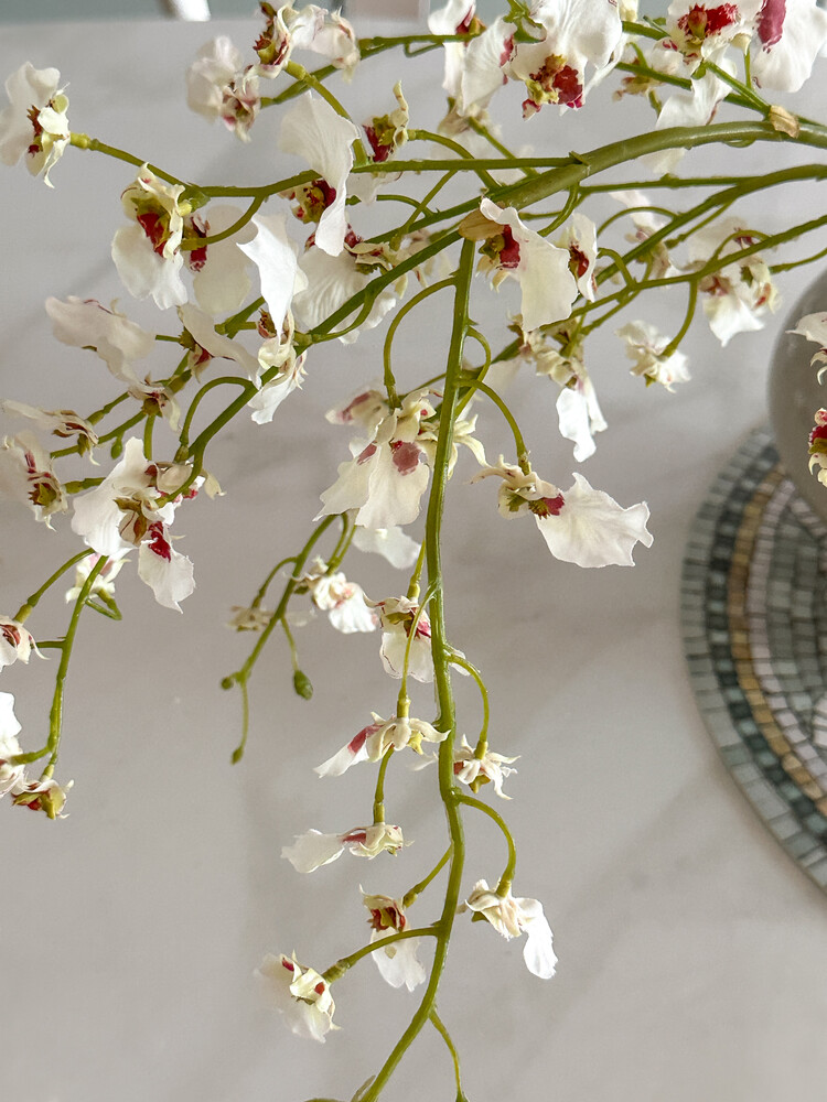 작은 흰 나비 여러 마리가 함께 앉은 듯한 모양을 하고 있는 화이트 온시디움입니다. 온시디움은 서양란의 한 종류예요. 꽃잎은 화이트 컬러, 중앙에는 진한 핑크가 물들어 있어 사랑스러워요. 긴 꽃대에 꽃잎이 풍성하게 달려 있어 1~2대만 꽂아도 멋스러운 연출이 가능하고, 3송이 이상 어레인지 하는 경우 화려한 느낌으로도 즐기실 수 있어요. 곧게 펼쳤을 때의 키가 103cm로, 줄기 아랫부분을 많이 접어 스타일링해 주셔야 합니다.