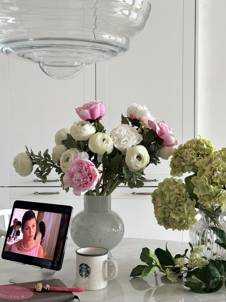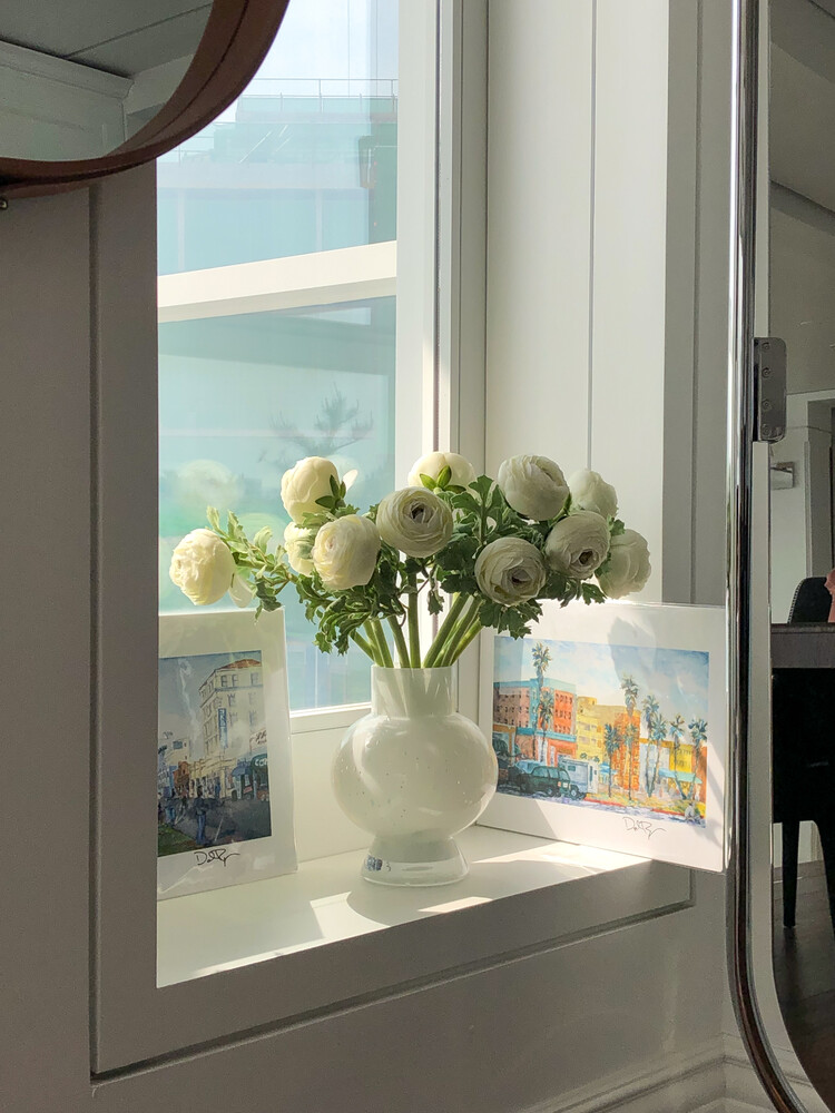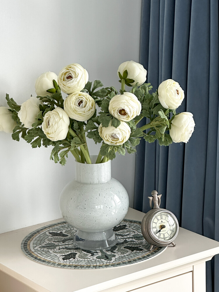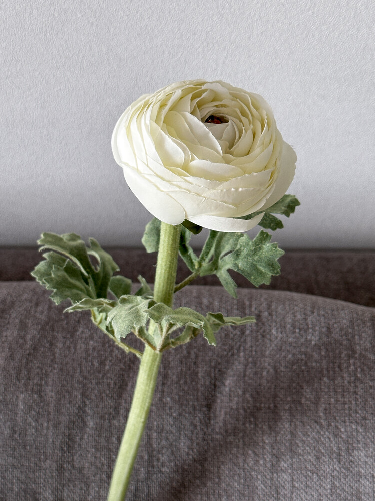 웜화이트 컬러의 라넌큘러스입니다. 다른 꽃들에 비해 꽃잎이 아주 얇고 하늘거려서, 더욱 사랑스럽고 자연스러운 느낌을 줍니다. 라넌 줄기와 잎의 보송보송한 잔털 질감을 잘 살렸어요. 라넌끼리만 여러 송이 꽂아도 예쁘고, 다른 그린 소재, 특히 Queen Anne's lace함께 매치하시면 더욱 화사하게 연출하실 수 있어요.