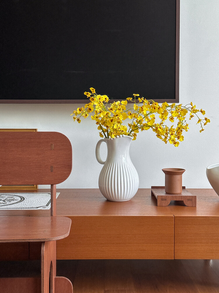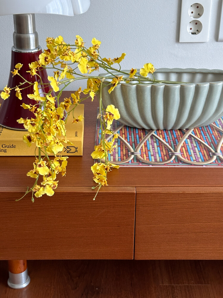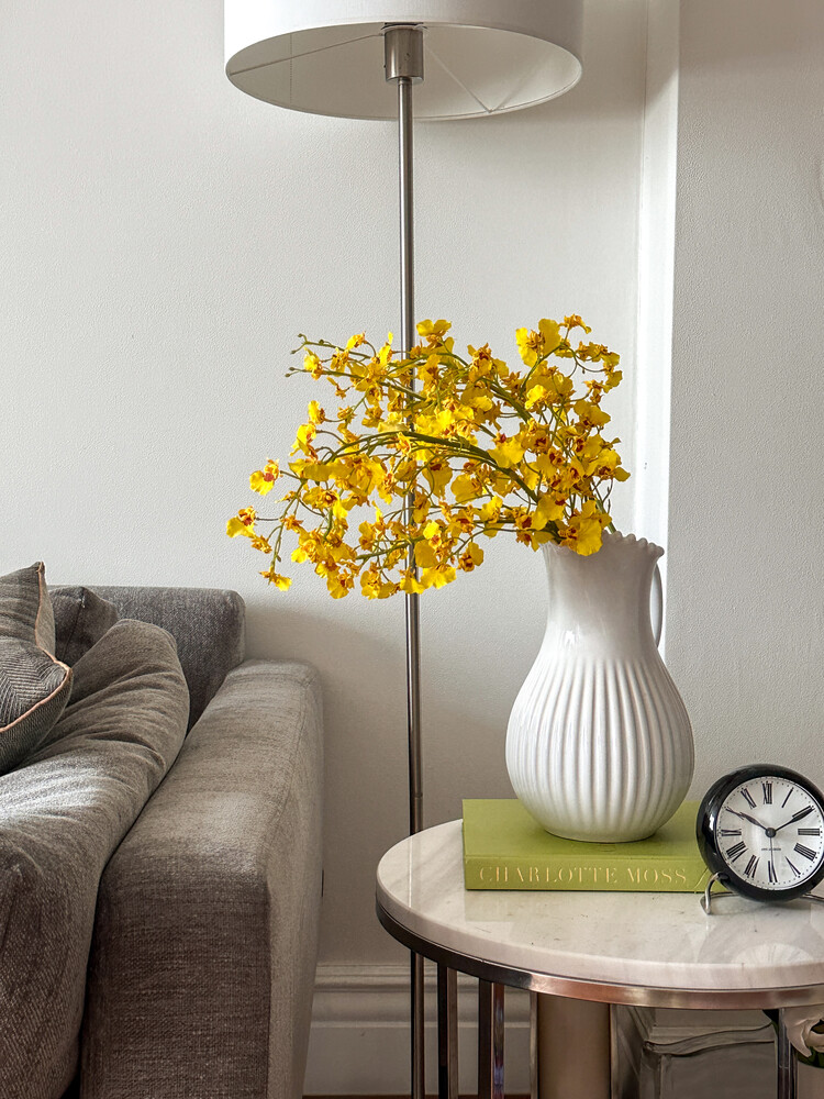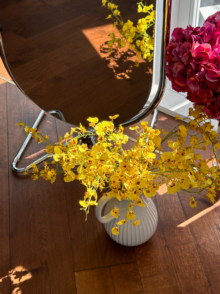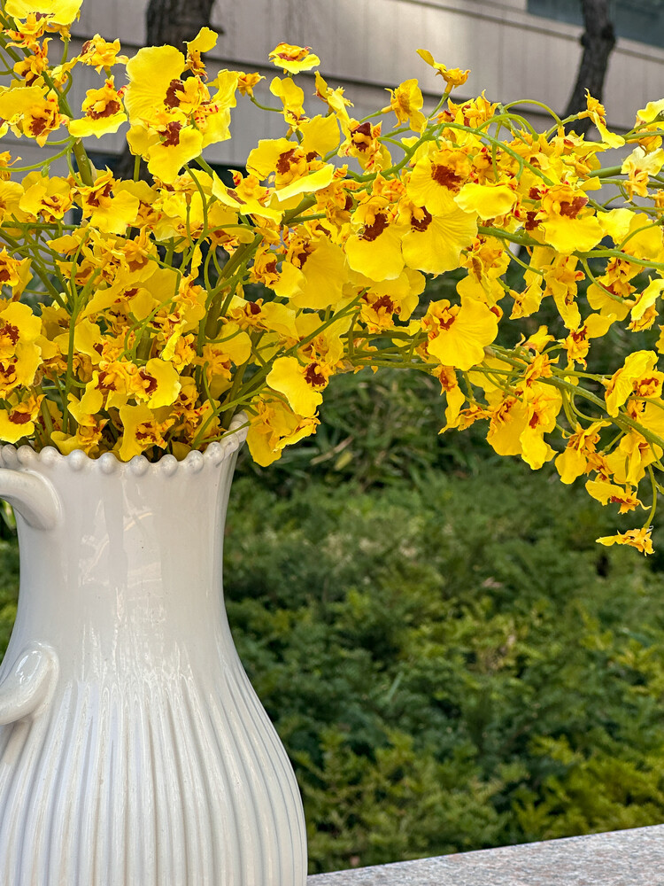 노란색 꽃잎들이 나비의 날개를 닮은 옐로우 온시디움입니다. 온시디움은 서양란의 한 종류예요. 샛노란 컬러가 봄-여름에 아주 화사하게 잘 어울려요. 긴 꽃대에 꽃잎이 풍성하게 달려 있어 1~2대만 꽂아도 멋스러운 연출이 가능하고, 3송이 이상 어레인지 하는 경우 굉장히 화려한 느낌으로도 즐기실 수 있어요. 곧게 펼쳤을 때의 키가 103cm로, 줄기 아랫부분을 많이 접어 스타일링해 주셔야 합니다.